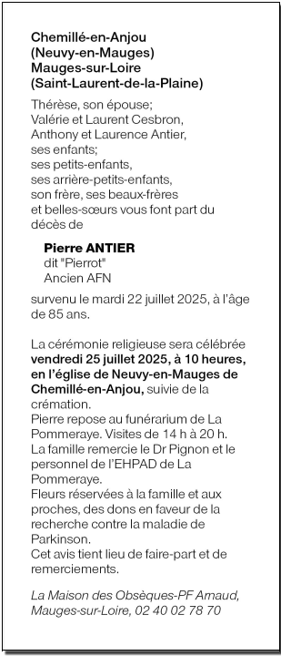 Cet espace « condoléances » est dédié à la mémoire de Monsieur Pierre ANTIER.