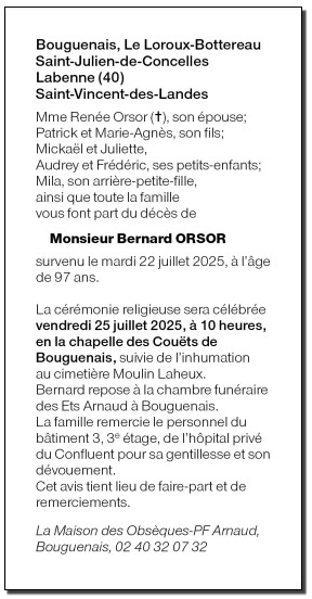 Cet espace « condoléances » est dédié à la mémoire de Monsieur Bernard ORSOR.