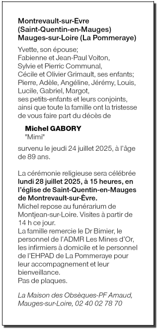 Décédé à La Pommeraye (49620) le jeudi 24 juillet 2025