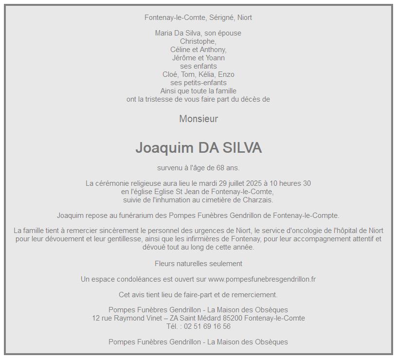Cet espace « condoléances » est dédié à la mémoire de Monsieur Joaquim DA SILVA.