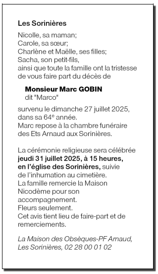 Cet espace « condoléances » est dédié à la mémoire de Monsieur Marc GOBIN.