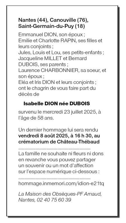 Cet espace « condoléances » est dédié à la mémoire de Madame Isabelle DION née DUBOIS.