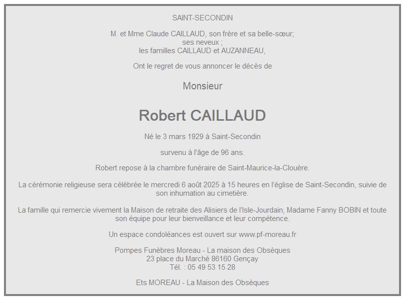 Cet espace « condoléances » est dédié à la mémoire de Monsieur Robert CAILLAUD.