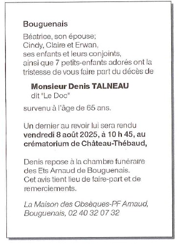 Cet espace « condoléances » est dédié à la mémoire de Monsieur Denis TALNEAU.