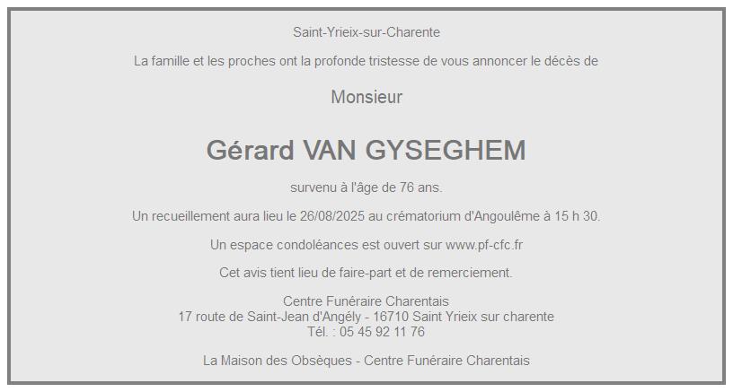 Cet espace « condoléances » est dédié à la mémoire de Monsieur Gérard VAN GYSEGHEM.