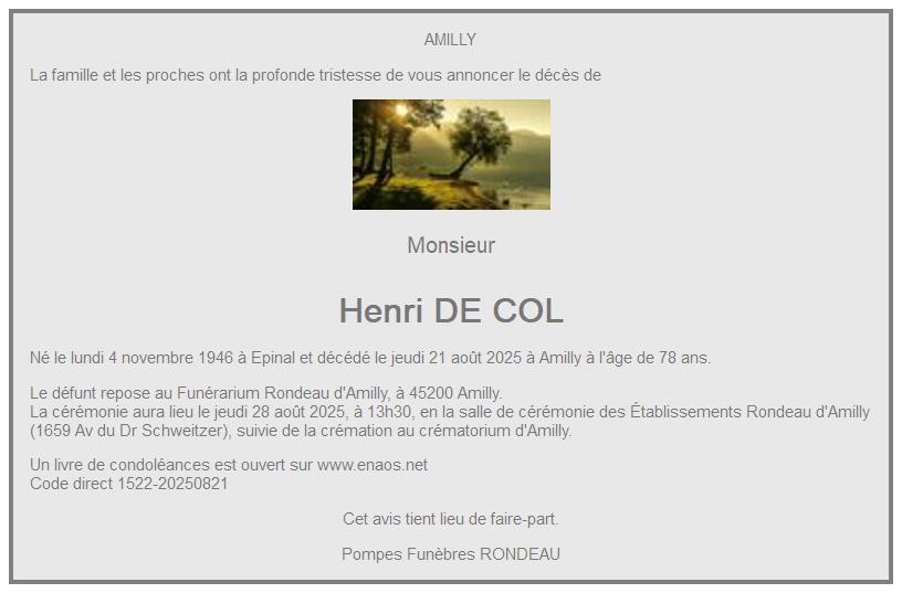 Cet espace « condoléances » est dédié à la mémoire de Monsieur Henri DE COL.