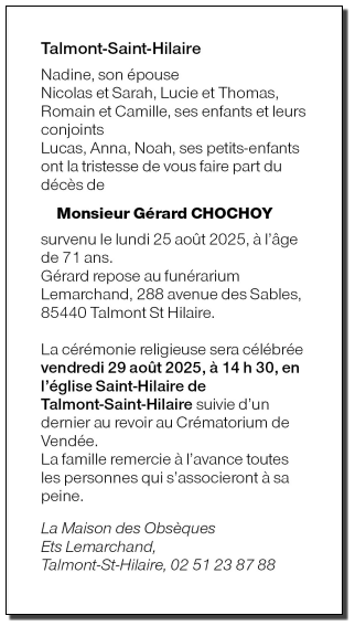 Décédé à Talmont-Saint-Hilaire (85440) le lundi 25 août 2025