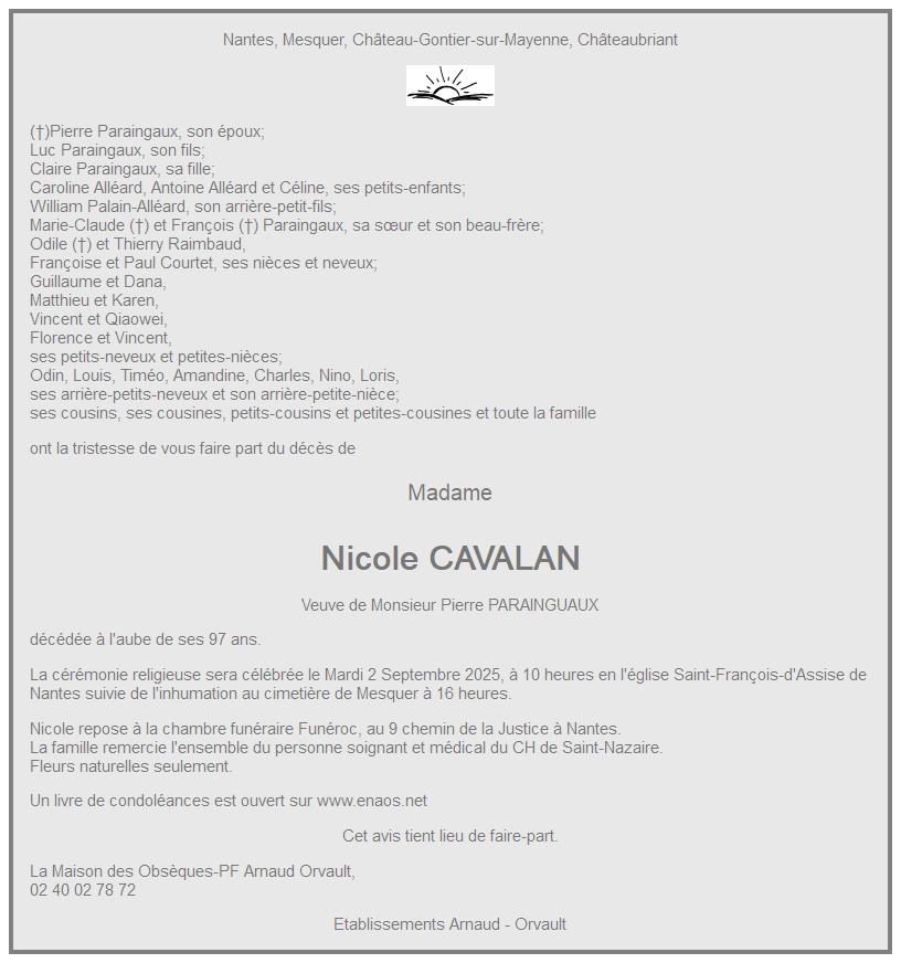 Cet espace « condoléances » est dédié à la mémoire de Madame Nicole PARAINGAUX née CAVALAN.