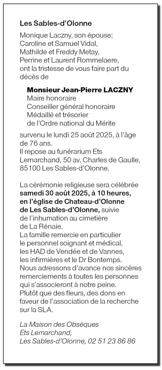 Cet espace « condoléances » est dédié à la mémoire de Monsieur Jean-Pierre LACZNY.