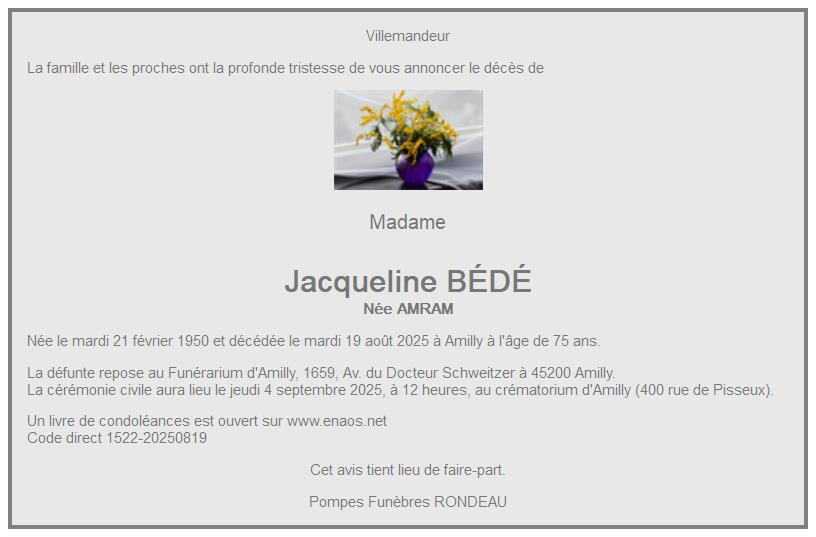 Cet espace « condoléances » est dédié à la mémoire de Madame Jacqueline BÉDÉ née AMRAM.