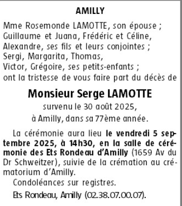 Cet espace « condoléances » est dédié à la mémoire de Monsieur Serge LAMOTTE.