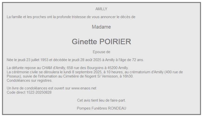 Cet espace « condoléances » est dédié à la mémoire de Madame Ginette POIRIER.