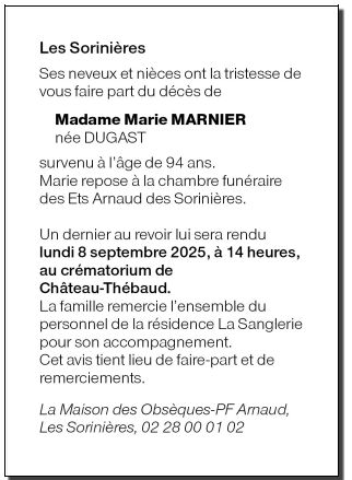 Cet espace « condoléances » est dédié à la mémoire de Madame Marie MARNIER née DUGAST.