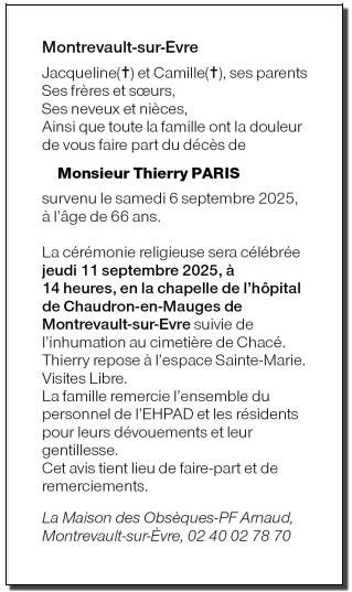 Cet espace « condoléances » est dédié à la mémoire de Monsieur Thierry PARIS.