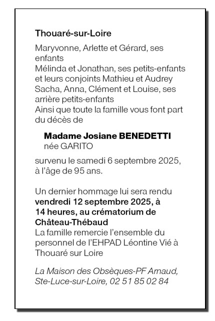 de Madame Josiane BENEDETTI née GARITO