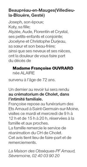 Cet espace « condoléances » est dédié à la mémoire de Madame Françoise OUVRARD née ALAIRE.