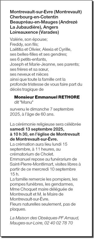 Décédé à Montrevault (49110) le dimanche 7 septembre 2025