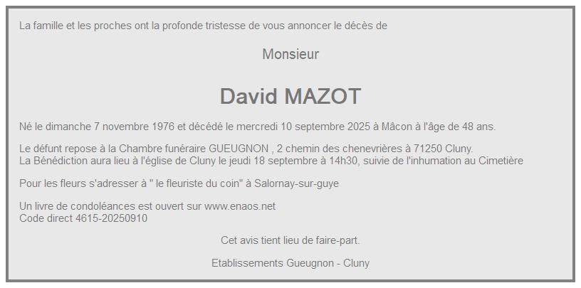 Cet espace « condoléances » est dédié à la mémoire de Monsieur David MAZOT.