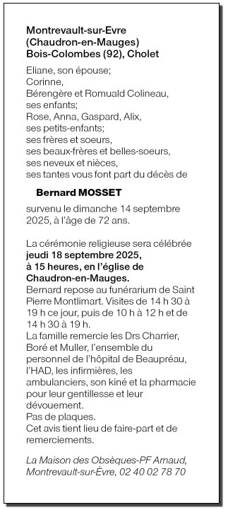 Décédé à Beaupreau (49600) le dimanche 14 septembre 2025