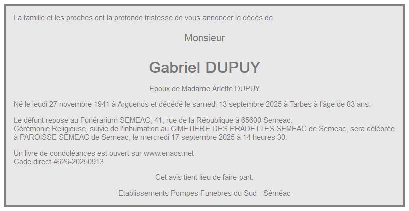 Cet espace « condoléances » est dédié à la mémoire de Monsieur Gabriel DUPUY.