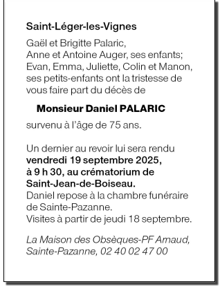 Cet espace « condoléances » est dédié à la mémoire de Monsieur Daniel PALARIC.