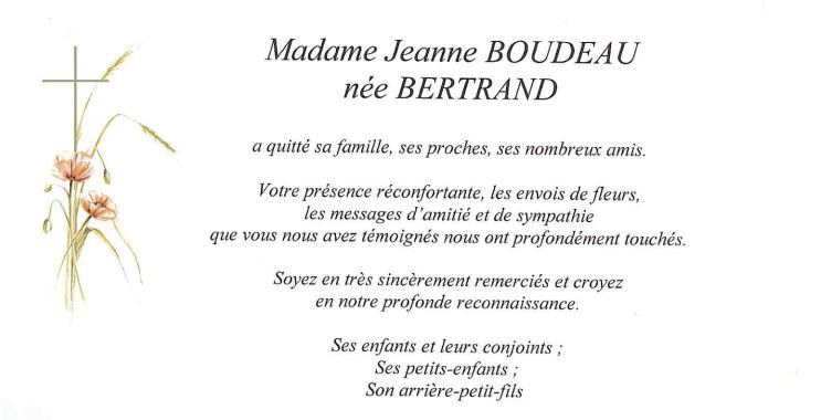 Cet espace « condoléances » est dédié à la mémoire de Madame Jeanne BOUDEAU née BERTRAND.