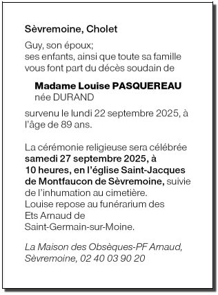 Cet espace « condoléances » est dédié à la mémoire de Madame Louise PASQUEREAU née DURAND.