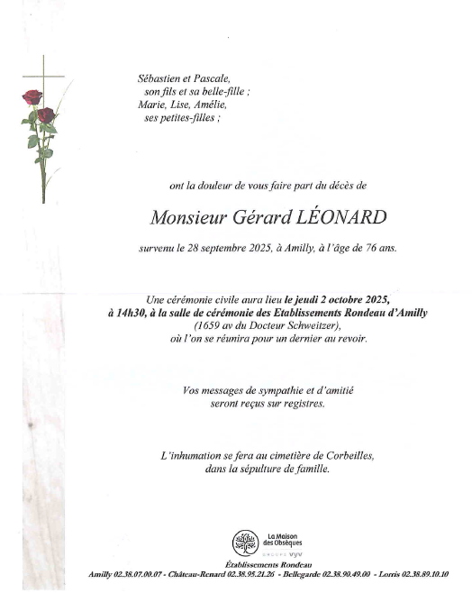 Cet espace « condoléances » est dédié à la mémoire de Monsieur Gérard LÉONARD.