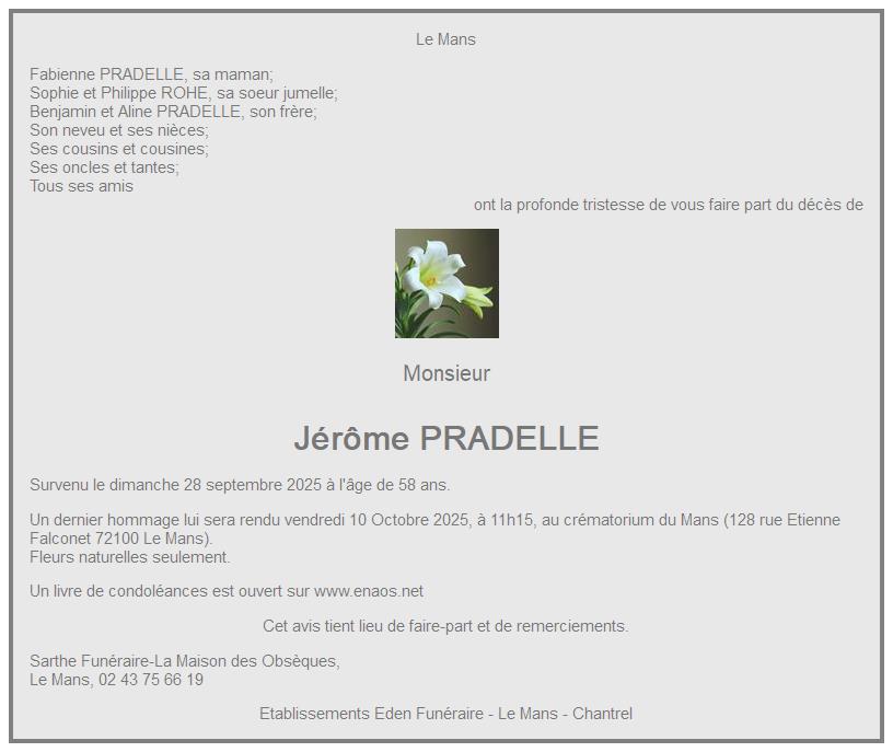 Cet espace « condoléances » est dédié à la mémoire de Monsieur Jérôme PRADELLE.