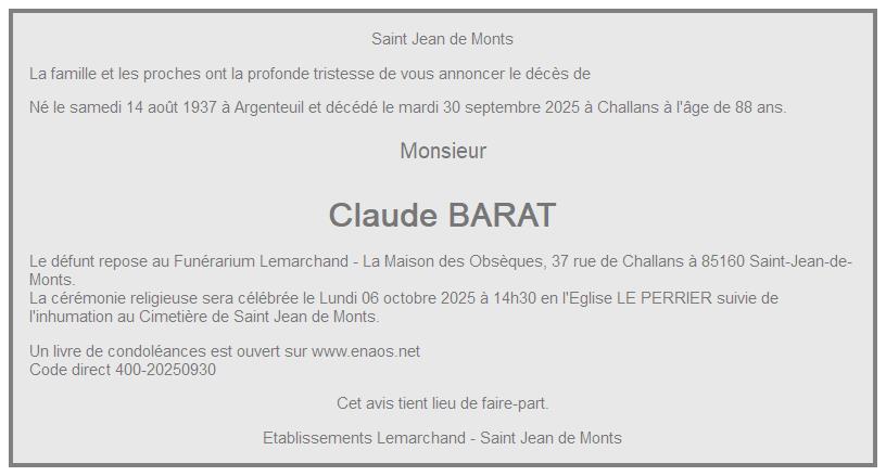 Cet espace « condoléances » est dédié à la mémoire de Monsieur Claude BARAT.