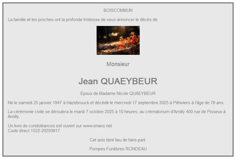 Cet espace « condoléances » est dédié à la mémoire de Monsieur Jean QUAEYBEUR.