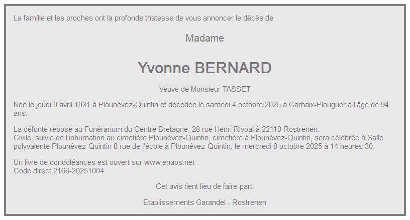 de Madame Yvonne TASSET née BERNARD