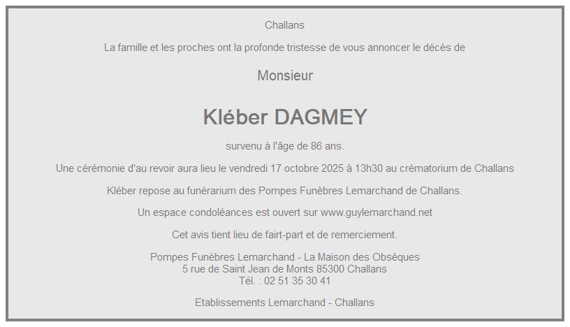 Cet espace « condoléances » est dédié à la mémoire de Monsieur Kléber DAGMEY.