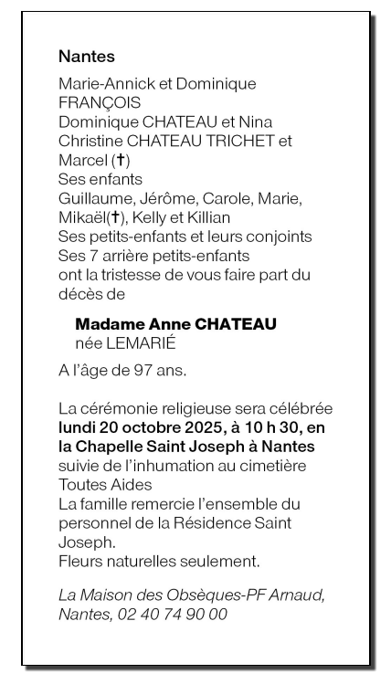 Cet espace « condoléances » est dédié à la mémoire de Madame Anne CHATEAU née LEMARIÉ.