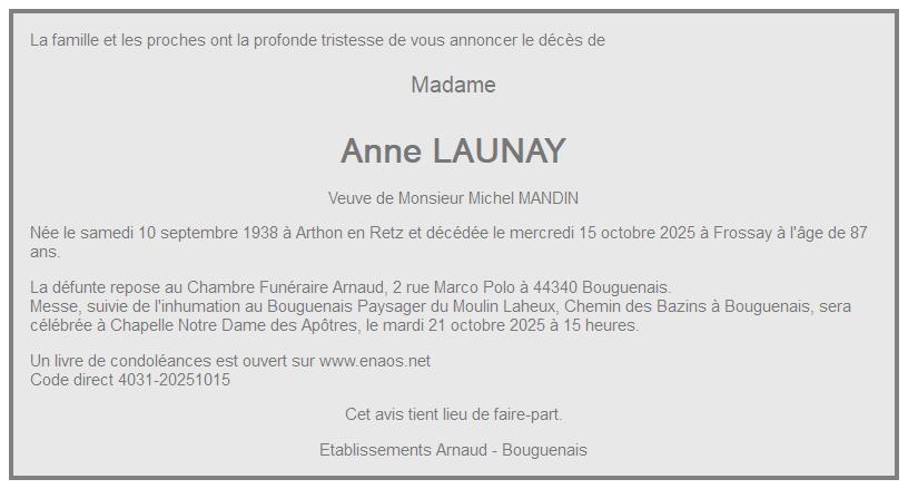 Cet espace « condoléances » est dédié à la mémoire de Madame Anne MANDIN née LAUNAY.