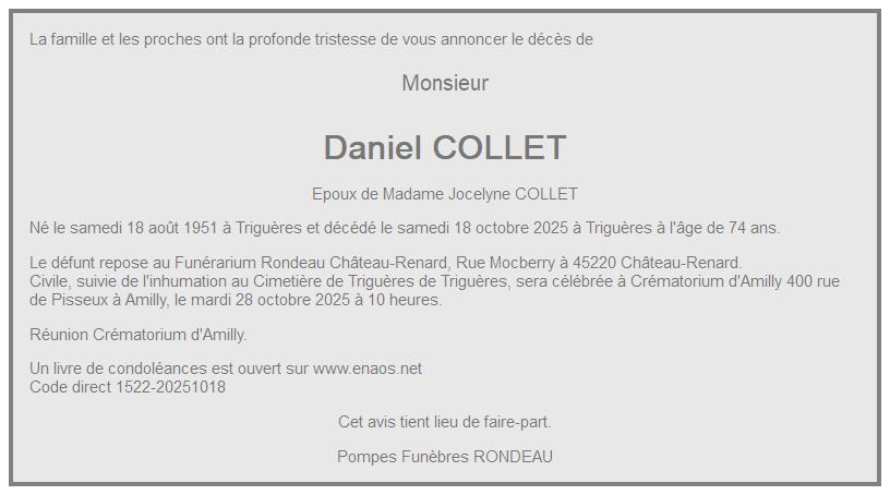 Cet espace « condoléances » est dédié à la mémoire de Monsieur Daniel COLLET.