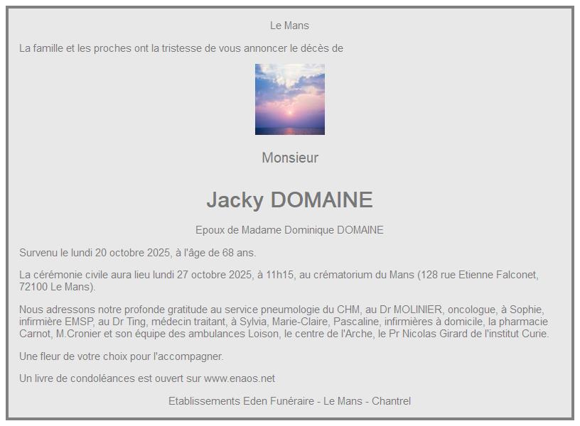 Cet espace « condoléances » est dédié à la mémoire de Monsieur Jacky DOMAINE.