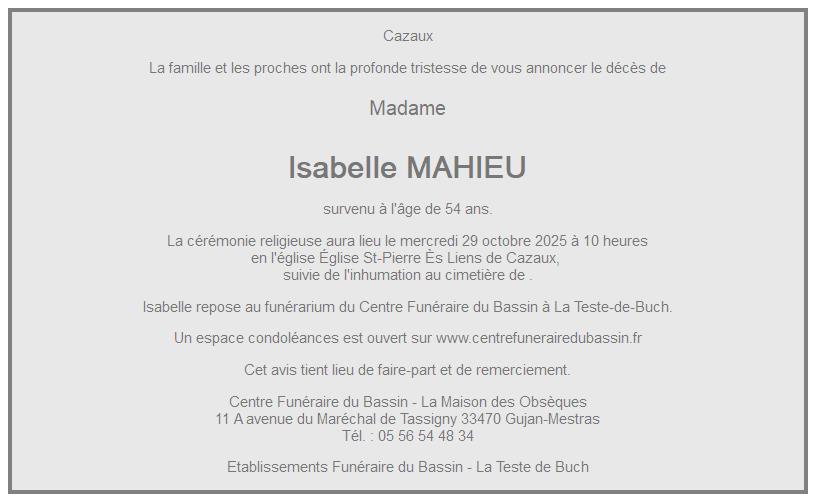 Cet espace « condoléances » est dédié à la mémoire de Madame Isabelle COUDRAY née MAHIEU.