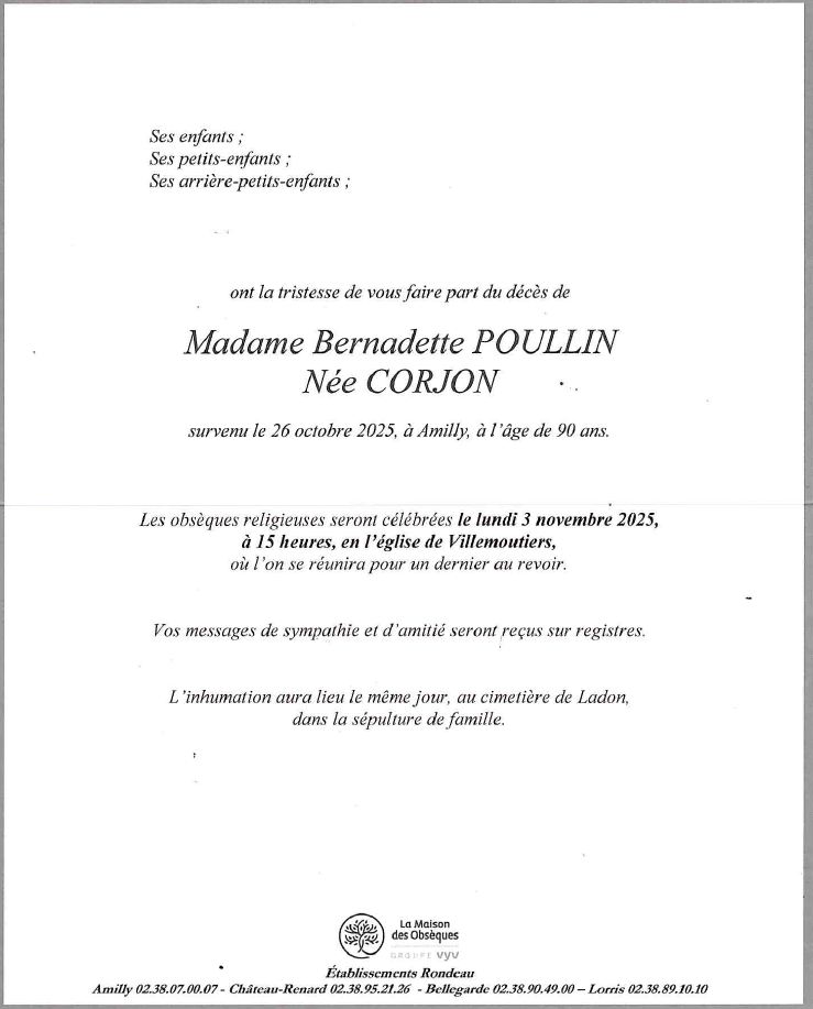 de Madame Bernadette POULLIN née CORJON