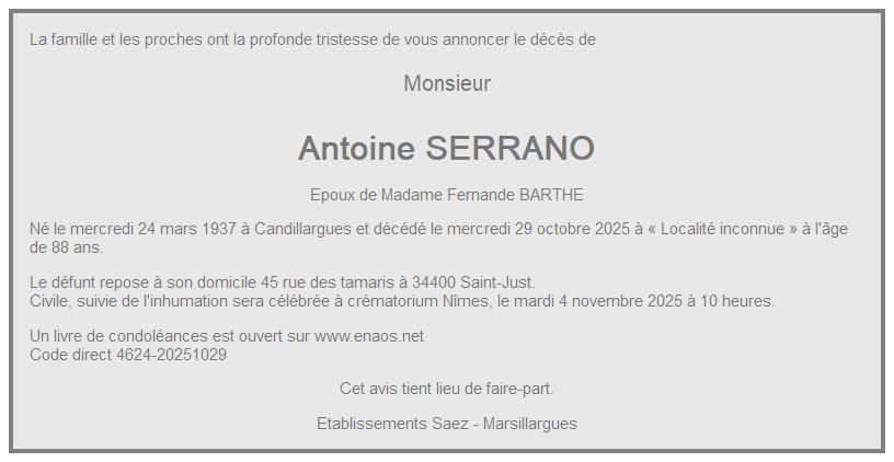 Cet espace « condoléances » est dédié à la mémoire de Monsieur Antoine SERRANO.