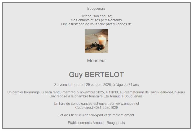 Cet espace « condoléances » est dédié à la mémoire de Monsieur Guy BERTELOT.