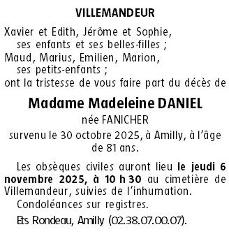 Cet espace « condoléances » est dédié à la mémoire de Madame Madeleine DANIEL née FANICHER.