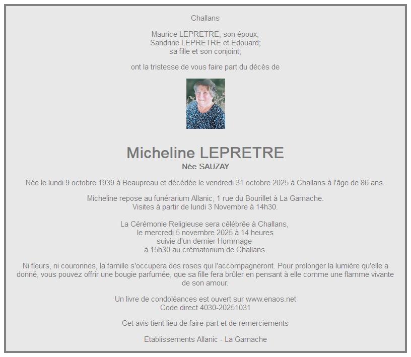 Cet espace « condoléances » est dédié à la mémoire de Madame Micheline LEPRETRE née SAUZAY.