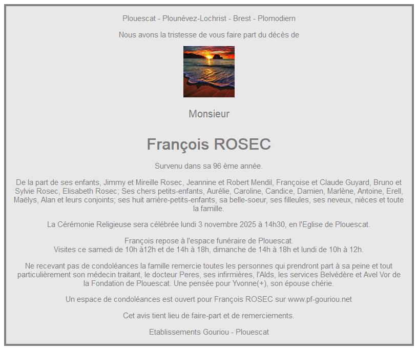Cet espace « condoléances » est dédié à la mémoire de Monsieur François ROSEC.