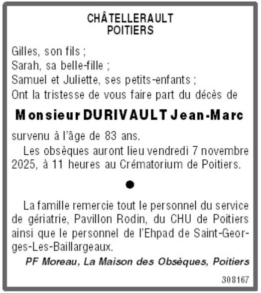 Cet espace « condoléances » est dédié à la mémoire de Monsieur Jean-Marc DURIVAULT.