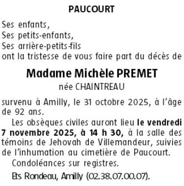 Cet espace « condoléances » est dédié à la mémoire de Madame Michèle PREMET née CHAINTREAU.