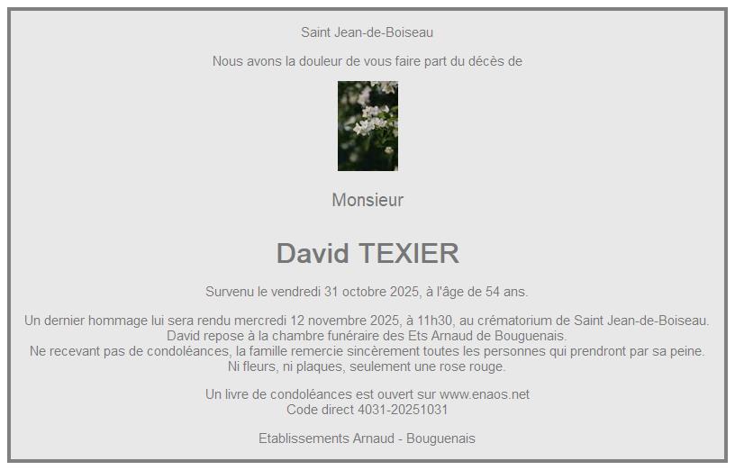 Cet espace « condoléances » est dédié à la mémoire de Monsieur David TEXIER.
