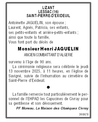 Cet espace « condoléances » est dédié à la mémoire de Monsieur Henri JAGUELIN.