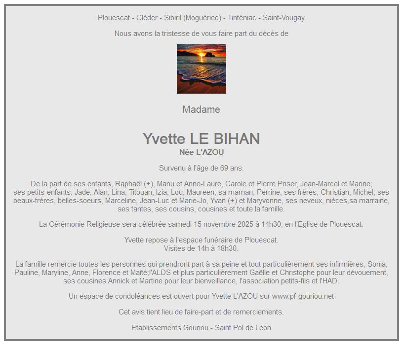 de Madame Yvette LE BIHAN née L'AZOU