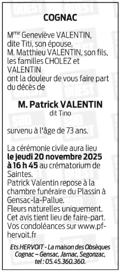 Cet espace « condoléances » est dédié à la mémoire de Monsieur Patrick VALENTIN.